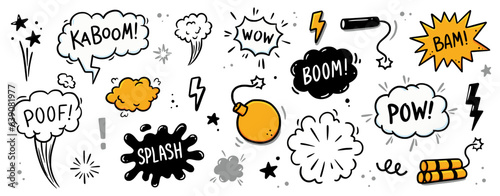 Bomb explosion or Comic explosion boom doodle hand drawn icon set. Outline drawing smoke cloud and fire flash. Atomic boom or dynamite detonation,