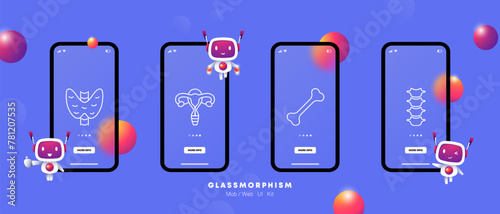 Organs set icon. Female reproductive organ, pelvis, ear, skeleton, skull, gradient, flat design. Nurturing and attending to one's physical and reproductive health concept. Glassmorphism style.