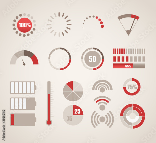 Pie charts, load indicators from 0 to 100%. They show processes such as progress, completion, loading and unloading of data.