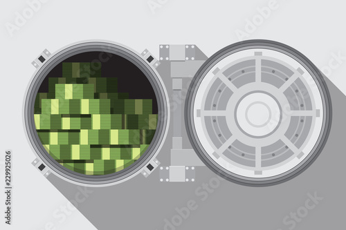 This vector illustration features an open bank vault containing stacks of money, symbolizing financial security, savings, and wealth