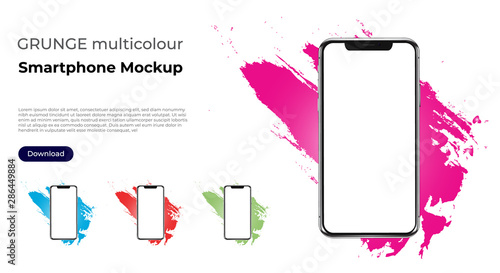 A generic smartphone mockup on randon grunge colorful background. Pink, green, blue, red. Template for app presentation for websites, landing pages.