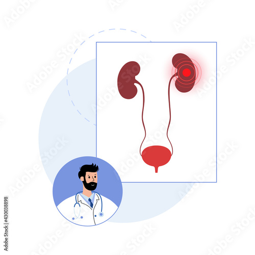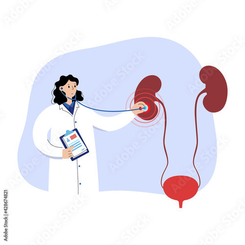 Scrutiny Kidney stone with magnifying glass.Nephrology.Pyelonephritis and renal failure disease.Inflammation in organ,cystitis chronic illness.Problem with filtration,dialysis.Vector in flat style