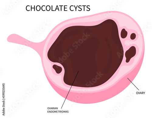 Ovarian endometriomas chocolate cysts Female reproductive system uterus problem. Human medical anatomy internal organs location scheme flat style icon vector illustration isolated on white background