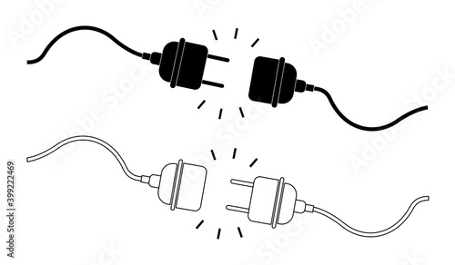Electric plug socket connect disconnect cable wire icon simple graphic illustration, idea of error failure 404 web page black white, electricity energy power cut, circuit network stop working image