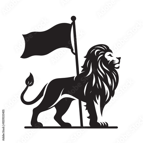 Black and white illustration of a lion standing proudly with a flagpole behind it.