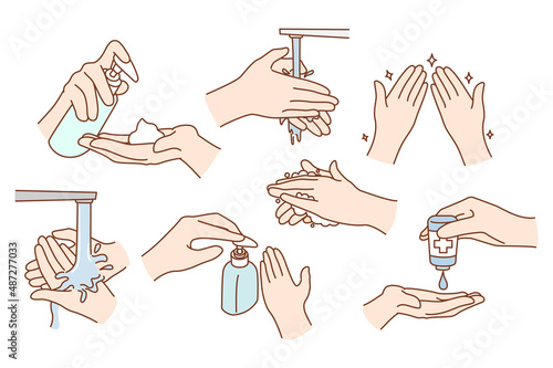 Hand cleansing, disinfection. Preventive measures against viruses and bacteria. Coronavirus control icons