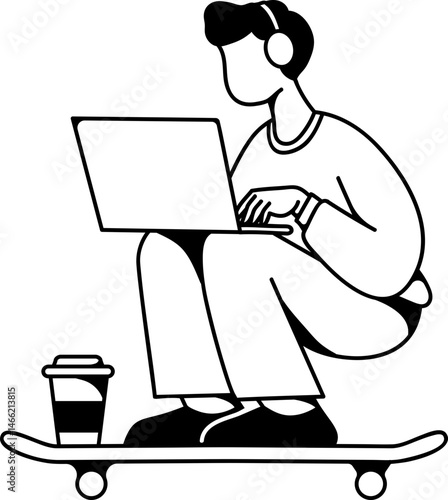 Boy jumping on a skateboard minimalistic vector outline illustration. Line art of Skateboarder jumping man playing skateboard.
