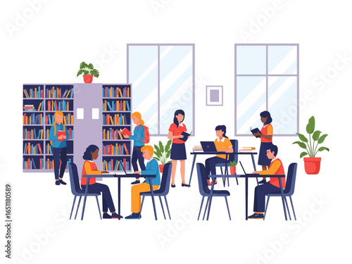A calm, inspiring illustration of well lit spacious hall for lectures and presentations highlights symmetry and balance. The classroom with whiteboard indoor background invites focus, discussion, and