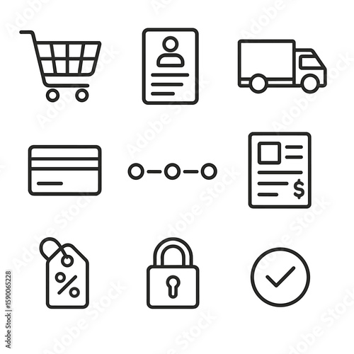 Icons for grocery delivery app: cart, payment, delivery, and shopping features
