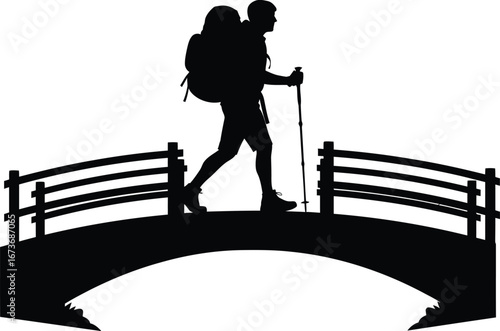 Silhouette of a hiker with a large backpack walking with trekking poles on a white background