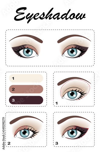 Eye makeup. Step by step, the eye shadow is applied. Eye color is dark brown.
