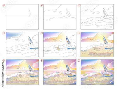 Drawing tutorial step by step lesson. How to draw a jellyfish? Educations worksheet and activity page. Vector illustration for children art.
