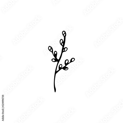 Vector linear willow branch with leaves. Hand drawn sketch by black ink , isolated on white element for floral, natural illustrations , design.