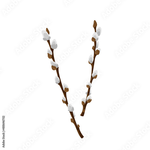 Spring twigs easter blossom pussy willow tree, vector flat illustration isolated on a white background.
