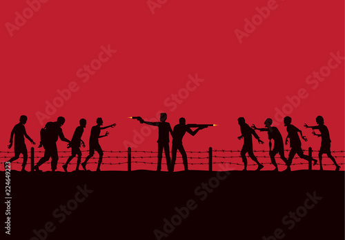 Silhouette of man killing zombie by shooting at head with rifle isolated on white background.