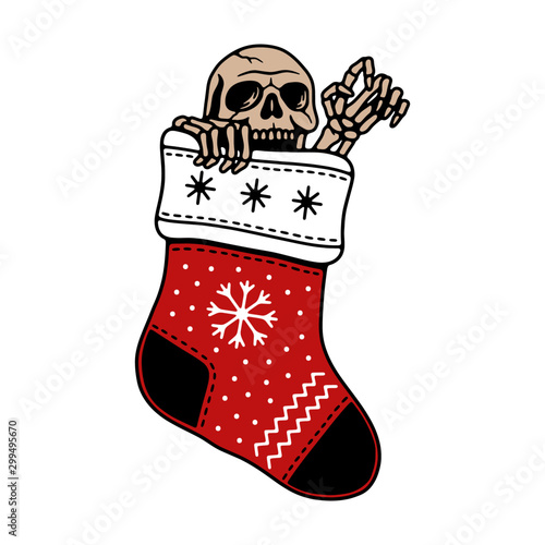 Christmas red stocking isolated on white background. Merry Christmas and Happy New Year groovy sticker. Funny retro flat cartoon character in trendy 60s-70s style.