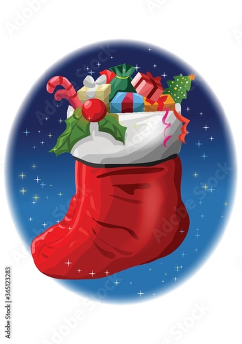 Cute hanging blue christmas stocking full of small gifts. Vector illustration of funny decoration. Winter holiday greeting card design. Merry Christmas and Happy New Year.
