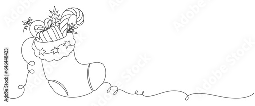 One continuous line drawing of Christmas socks. Festive garland for xmas banner in simple linear style. Elegance logo editable stroke. Doodle vector illustration