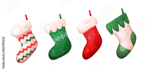 Christmas stockings. Various traditional colorful and ornate holiday stockings or socks collection. Cartoon New Year vector eps 10 illustration isolated on white background in a flat style.