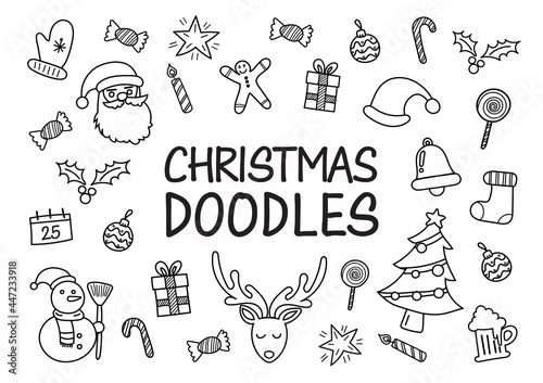 Christmas greeting card with colorful christmas socks. Christmas winter design element in doodle style.