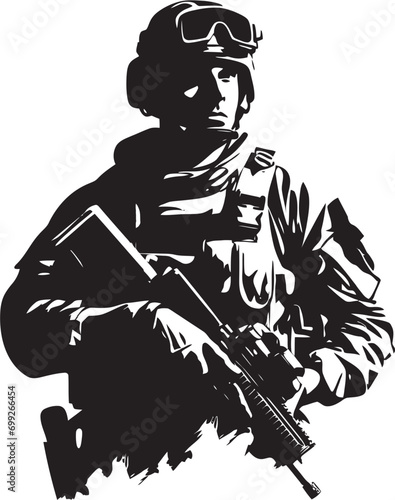 Military symbols and icons representing various aspects of armed forces, including personnel, equipment, and medals