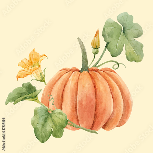 Watercolor autumn abstract background with pumpkin and seasonal leaves