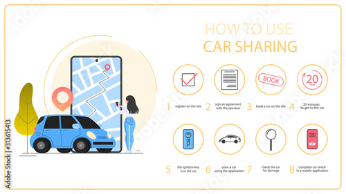 Renting a new or used car. Car rental booking reservation banner. Vector illustration background