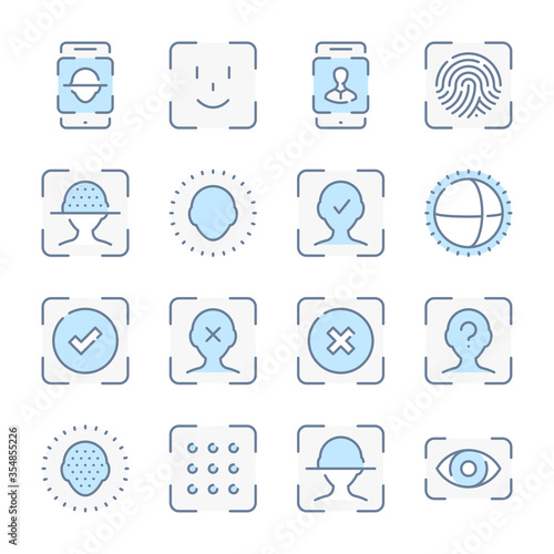 Face Identification and Recognition related blue line colored icons. Biometric Authentication icon set.