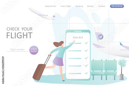 Vector woman ready to travel using phone to book flight tickets while sitting on suitcase at airport