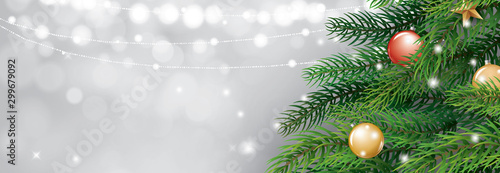 Christmas tree with gold blur bokeh lights background. Vector illustration for cover, banner, greeting card template.