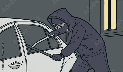 Burglar breaking car window with crowbar in dark hoodie and mask illustration for security awareness and crime prevention concept