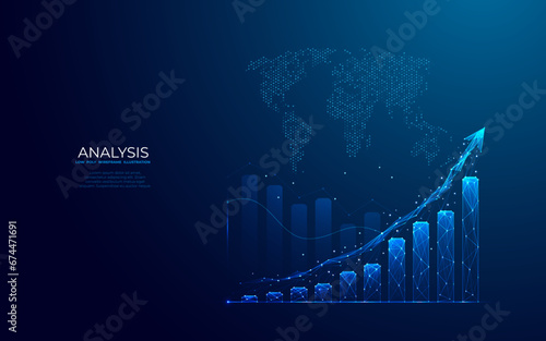 Digital growth graph chart on technology map. Abstract business analysis and stock market concept. Low poly wireframe vector illustration on dark background in futuristic light blue hologram style.