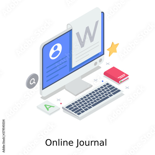 Online news blog magazine article on laptop screen, digital journal subscriber concept, vector illustration.