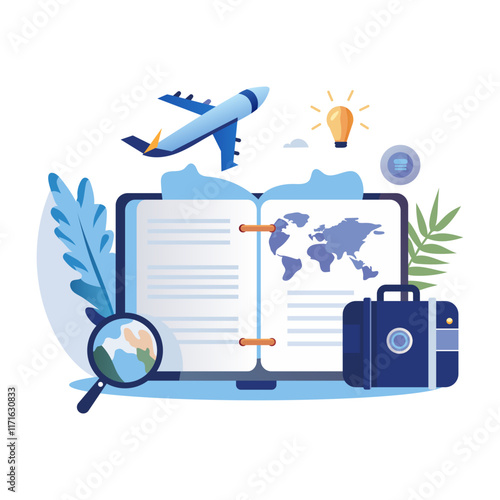 Isometric screen for travel journal or expedition photo album scrapbook, tourism memory book or journey planning organizer application. Mountain and forest, river and compass, camera. Smartphone app