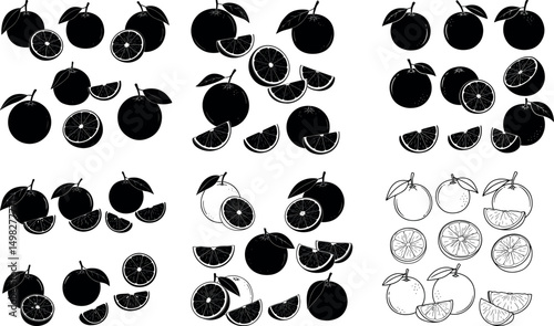 Hand drawn line art citrus fruit slices set featuring various segmented fruit designs for healthy food and drink concepts