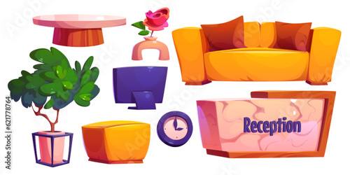 Cartoon set of hotel reception furniture isolated on white background. Vector illustration of yellow couch, computer monitor, wooden table, tree pot, flower in vase, wall clock. Lobby design elements