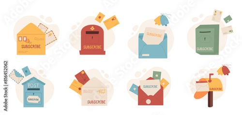 Flat style handmade mailbox with envelopes newsletter concept, cartoon craft mail flying from postboxes subscription invitation template, creative paper post card. trendy handwritten envelope design,