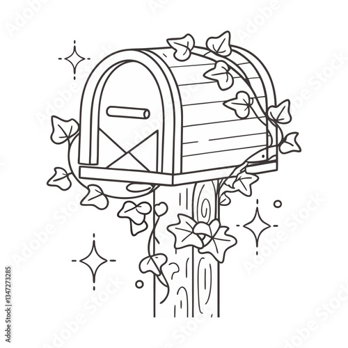 Rustic mailbox vector with ivy vines, featuring a wooden post and an envelope inside, drawn in a minimal line art style with decorative sparkles.