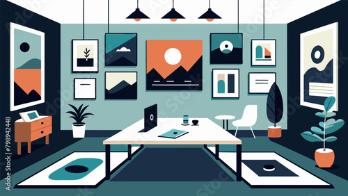 A tasteful gallery wall featuring black and white abstract prints serves as a focal point in a sophisticated office design..