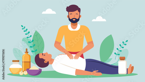 A man receives a massage using herbal oils and techniques based on Ayurveda principles promoting physical and emotional wellness..