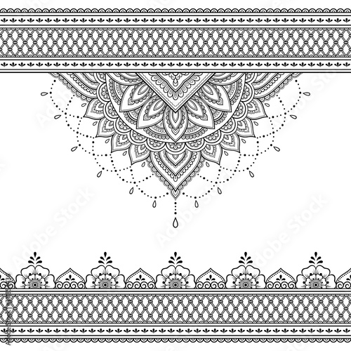 Set of seamless borders and circular ornament in form of frame for design, application of henna, Mehndi, tattoo and print. Decorative pattern in ethnic oriental style.