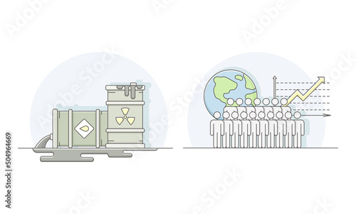 Ecological problems set. Deforestation, animal extermination, fire, oil and gas extraction, air pollution vector illustration