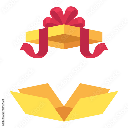 Single yellow open gift box icon, present with red ribbon bow flat isometric illustration design, surprise confetti inside, vector interface app icon ui ux banner web isolated on white background