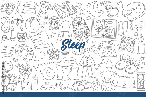 Cartoon good night posters. Cozy pajamas, bed, pillows, moon, bedtime. Trendy night illustrations in doodle retro style. Banners for wall and gift cards