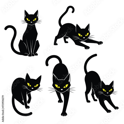 A collection of six cartoon black cats in various Halloween poses, some playing with a jack-o'-lantern.