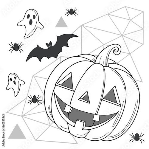 A stylized black cat with bright yellow eyes sits beside a cheerful jack-o'-lantern and abstract autumn leaves, perfect for Halloween designs.