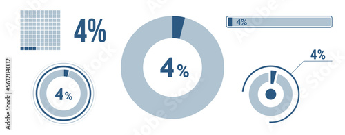 4% percentage infographic set. Four circle diagram, pie donut chart, progress bar. 4 percent loading data icon. Vector concept collection.