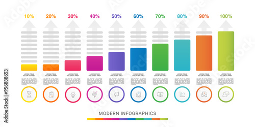 Presentation of modern vector infographic. Business template with 10 steps, arrows with illustration Infographic for bar graph, chart, app, website. Progress bar with ten steps percentage diagrams.