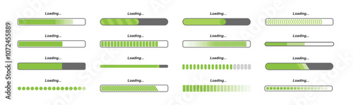 Percentage loading bar infographic icon set 0-100% in green colour. set of percentage loading bar  10%, 20%, 70, 90%, 100% in green color. Rectangle bar percent loading and process symbols collection.