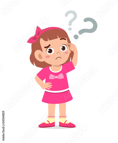 Thinking, pupil, dream set concept. Young pensive girl has question and thinking about problem. Happy thoughtful satisfied kid is dreaming. Smiling child pupil is solving riddle. Simple flat vector.